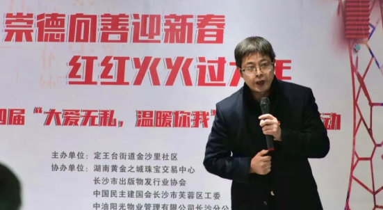 2月3日上午10:00,湖南长沙定王台街道黄金之城咖啡厅外面依旧是寒风萧瑟,阴雨绵绵,屋内却是另一番红红火火、喜庆温暖的氛围。这里正在举行的,是由定王台街道金沙里社区和黄金之城珠宝中心联合发起的“大爱无私,温暖你我”的社企共建活动。