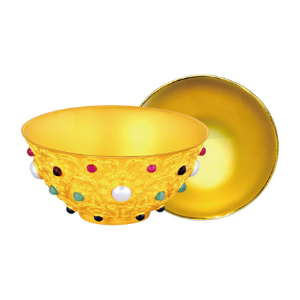 【传家宝 金饭碗】外形取自乾隆内府专用黄釉婉之典雅外形,图案取自盛唐时期皇室器皿之富贵图饰,工艺上除了现代工艺外还采用了自汉朝流传下来的传统雕、镶技法,碗底以精美的秦朝小篆铭刻出产品的唯一编号。 整个金碗造型大气十足,外镶红蓝宝石各8粒、碧玺4粒、翡翠8粒、珍珠四颗,处处渗透着尊贵、富足的气息,传达着对后世子孙“富贵永随”的祈愿。
