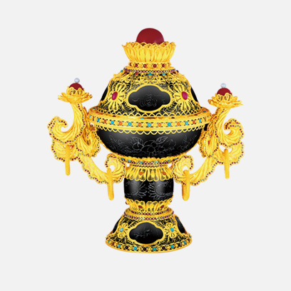 藏品以墨玉制成炉身,以金包银花丝覆盖其上,并以花丝堆垒成莲花瓣图案,炉身之上金包银花丝留空处形成朵朵祥云图案。祥云内以银丝编成蝙蝠寿桃图案表达“福寿之意”其中蝙蝠又怀抱铜钱,巧妙地运用谐音表达“福在眼前”的祝福。并镶嵌有佛教七宝之一的玛瑙等宝石,既可作为摆件祈福纳祥,又可作为高端贵金属艺术品进行投资、鉴赏与收藏。